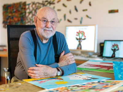 The news of Eric Carle’s (1929–2021) death last May sparked a worldwide outpouring of affection from four generations of readers who were moved to recall the joy his books had given them over the years. Eric always seemed a little puzzled by the outsized success of his picture books and would sometimes quote a sardonic old German proverb — “The dumbest peasant grows the biggest potatoes” — by way of suggesting that perhaps sheer luck had had something to do with it. In more reflective moments, he attributed the popularity of his best-known picture book, The Very Hungry Caterpillar, to the fact that children everywhere seemed to find the same message of hope in its story. Paraphrasing that message, he said: “You — little insignificant caterpillar — can grow up into a beautiful butterfly and fly into the world with your talent.”