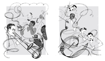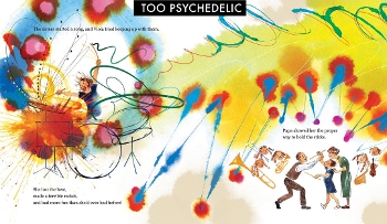 Susanna Chapman: My first mistake was assuming that contrasting splats and bursts of colors would communicate percussion. Instead it looked psychedelic — oops! (If anyone needs an illustrator for Jefferson Airplane…I am ready to go.) I knew I had to do more listening to big band music and experimenting. Eventually I started cutting paper to punctuate melodic swirls and felt that expressed the physical presence of drums well. Too much paper weighed down the energy, and color schemes appropriate to Viola Smith’s musical era (1920s on) were important.
