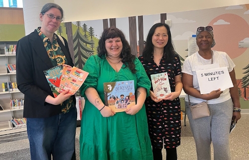 Kicking off the storytime sessions at the library was Hannah Moushabeck reading her 2023 picture book debut Homeland: My Father Dreams of Palestine, winner of The New England Book Award and The Arab American Book Award. Up next was Jannie Ho, with The Lost Mitten, an I Like to Read: Comics! book that was an ALA Best Graphic Novels for Children Reading List Selection.