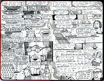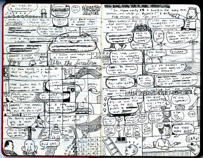 LP: Yeah. I write them out in little sketchbooks, little Moleskines. I make notations, or I draw speech bubbles — I don’t actually draw any pictures at the early stages, I just focus on the writing, and I’ll make an indication that this is going to be inside a panel, this is going to be a paragraph. I’m thinking about those divisions right from the start.