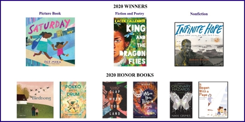 A winner and two honor books were selected in each of three categories: Picture Book, Fiction and Poetry, and Nonfiction. The winning titles must be first U.S. editions of books published between June 2019 and May 2020, but may be written or illustrated by citizens of any country.
