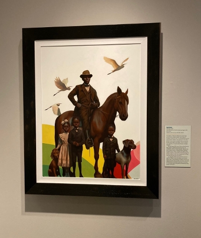 Nelson's Prideland re-imagines the medal's illustration, using the same basic cast: one horse, one man, three children, two dogs, three birds. We see a man astride a horse, but here it's a Black man, the horse is not galloping but standing still, and the man is facing the viewer, though his face is partially obscured by his hat. The man is, as I said, quite still. And yet. There is a powerful sense of as-yet-unleashed movement and potential kinetic energy. One of the man's hands is in his pocket; the other holds the reins, lightly but surely. The man is calm but...ready, alert. The three children gathered around him, dressed in their best, gaze solemnly out at the viewer. Two dogs flank the children, one looking at the viewer like the children; the other looking right. If this illustration were in a book, the dog would be looking toward the page-turn, and thus looking ahead. The birds also fly toward the right — again, toward the page-turn; toward whatever's coming next.