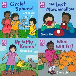 In board book form, Lin accomplishes that most difficult of tasks: creating engaging, accessible, age-level-appropriate, not-too-fussily illustrated stories that also teach something. In this case it’s math. Each entry homes in on a specific mathematical concept, while together providing a tour through the seasons — and a slice-of-life portrait of three friends, Olivia, Mei, and Manny. In the springtime-set Knees, Mei observes measurement and comparison as she cultivates a sunflower. Circle! Sphere! proves the mind-stretching fact that the children’s three different-shaped bubble wands produce the same-shaped bubble. Fit’s setting is a fall farmers’ market and illustrates Olivia’s spatial sense (and taste in produce). Wintry Marshmallow touches on division, both mathematical (how to split three marshmallows between two girls…) and behavioral (…without ruining the friendship). The illustrations are signature Lin — think The Ugly Vegetables (rev. 9/99) and the Ling and Ting books — with bold, saturated hues; thick black outlines; judicious use of frames; eye-pleasingly tidy details; and nothing extraneous. Brief “Exploring the Math” notes and “Try This!” suggestions, addressed to adults and written by an early math expert, are appended. All together, these diminutive math storybooks add up to a whole lot of fun.