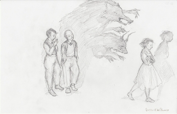 I could feel the injustice through the powerful words and imagery that you were painting of what happened to Rosalind, and through that first sketch I wanted to convey how I felt they preyed on her in a monstrous way! I knew at the time it might be a bit too much of a Grimms’ fairy-tale approach. In the end I still tried to express the darkness, but also their shadows are bouncing off of the light that is surrounding Rosalind as she walks off the page. I wanted to show a feeling of hope for anyone who has ever been treated unfairly or without kindness. Marching forward, so to speak, and shaking their dust off of her.