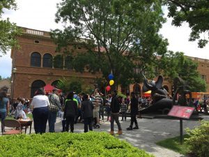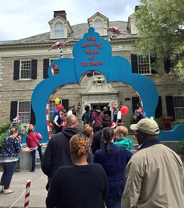 “Look at all those Cat-in-the-Hat hats!” my daughter exclaimed, and yes, red-and-white-striped top hats were ubiquitous on the heads of parade participants and spectators, alike. As we entered the Quadrangle we were met with the sight of hundreds of people cheering the ribbon cutting, taking photos with costumed characters, clowns, stilt walkers, and an enormous Cat in the Hat balloon, and lining up for the first round of ticketed entry into the Seuss Museum.