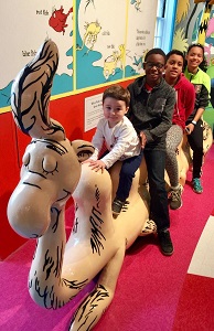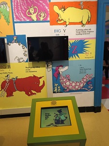 “It’s fun to have fun, but you have to know how” opines The Cat, and my kids got right down to having fun in the adjoining first-floor rooms, which invite visitors to draw on a screen (just as young Ted Geisel drew on his bedroom walls), to read Seuss’s books, to build a zoo with Duplo blocks, to engage with early literacy skills activities, and to cavort with models of some of Dr. Seuss’s most beloved characters.