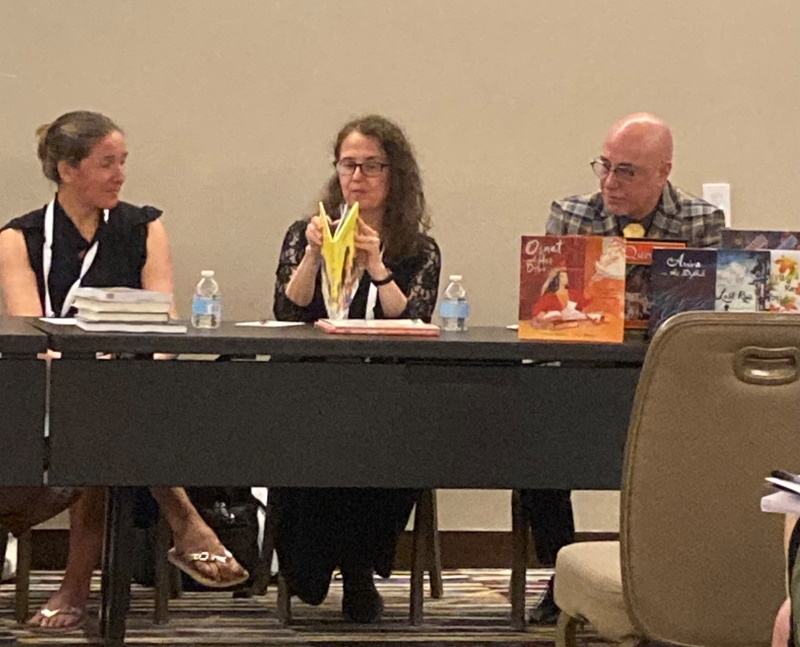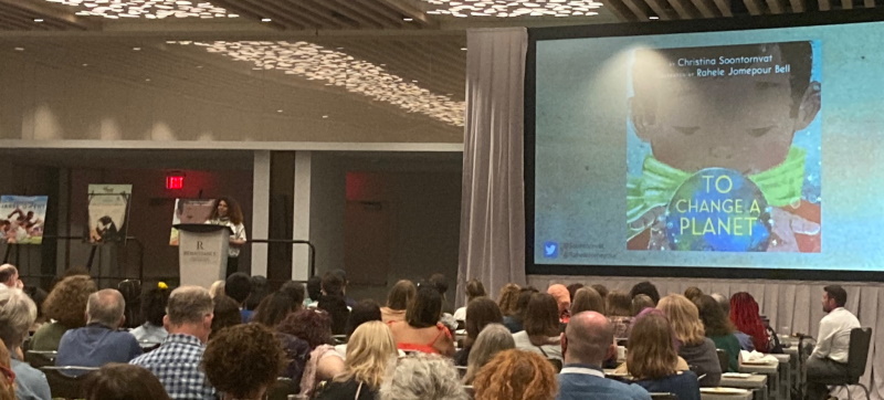 I also was privileged to attend some unforgettable events and presentations. First was a magical conversation on a rooftop at sunset between Clint Smith (writer for The Atlantic and author of How the Word Is Passed: A Reckoning with the History of Slavery Across America) and Kwame Alexander about the latter's forthcoming historical novel The Door of No Return, published by Little, Brown, set in 1860 in Asante Kingdom (present-day Ghana). Both the questions and the answers were deep and thoughtful (and Kwame's story about growing up celebrating Kwanzaa while all his friends enjoyed the more commercial experience of Christmas should be shared more widely!). A presentation by author Elizabeth Partridge and illustrator Lauren Tamaki about their unusually close collaboration on Seen and Unseen: What Dorothea Lange, Toyo Miyatake, and Ansel Adams's Photographs Reveal about the Japanese American Incarceration, published by Chronicle Books, was fascinating and revelatory (as is the book itself).