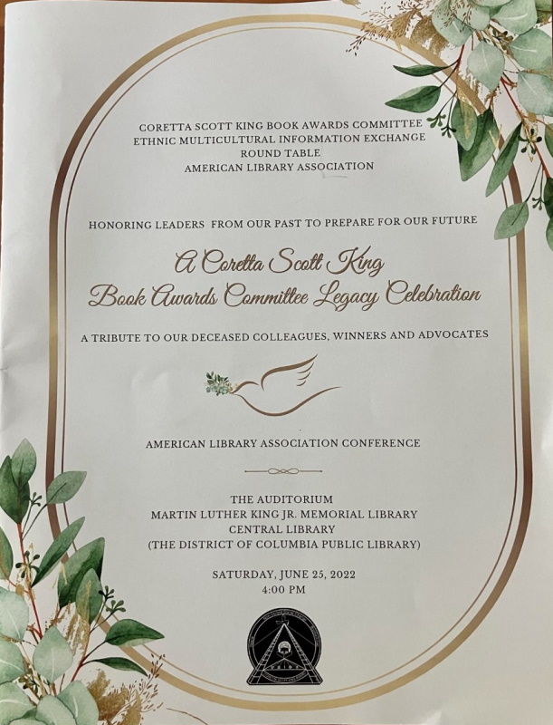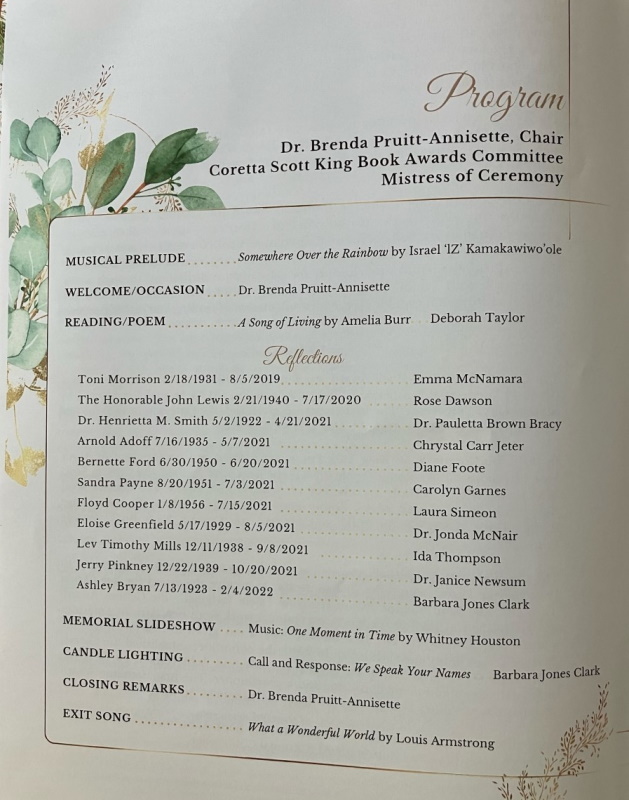 The final event I was able to attend, the CSK Book Awards Committee Legacy Celebration, honored eleven "deceased colleagues, winners and advocates," all of whom passed in 2021: Toni Morrison, the Honorable John Lewis, Dr. Henrietta M. Smith, Arnold Adoff, Bernette Ford, Sandra Michelle Payne, Floyd Cooper, Eloise Greenfield, Lev Timothy Mills, Jerry Pinkney, and Ashley Bryan. The moving ceremony managed to be solemn and celebratory at the same time. There was a great deal of smiling through tears, as for instance when the assembled viewed an image of Ashley Bryan, arms spread wide, joyfully exhorting an audience to join him in reciting a poem.