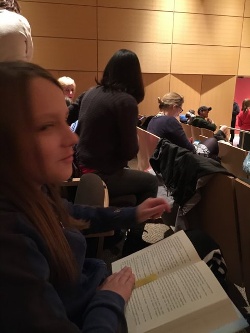 We spent an hour and a half behind this super fan (below). In addition to her backpack, she was wearing a Wings of Fire t-shirt and carrying a stack of well-read books and a huge WoF poster to be signed. She practiced questions she wanted to ask Tui, but as time went on (and on), she agreed with her mom that maybe she should limit her questions (thankfully).