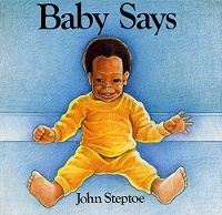 In his tragically short career as a picture book creator, John Steptoe received attention for his groundbreaking early books — such as Stevie and My Special Best Words — and, later on, for his lavishly detailed folktale retellings, The Story of Jumping Mouse and Mufaro’s Beautiful Daughters. Published in 1988, a year before Steptoe died at age thirty-eight, Baby Says was deceptively simple compared to Steptoe’s other work. As a result, it goes largely overlooked.