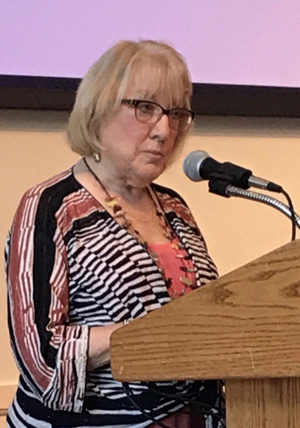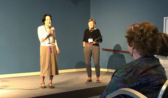 Yasuko Fujiwara of Hiroshima, Japan, speaks to attendees after dinner. Betsy Bray, one of the symposium organizers, is on the right. Photo: Marta McDowell.