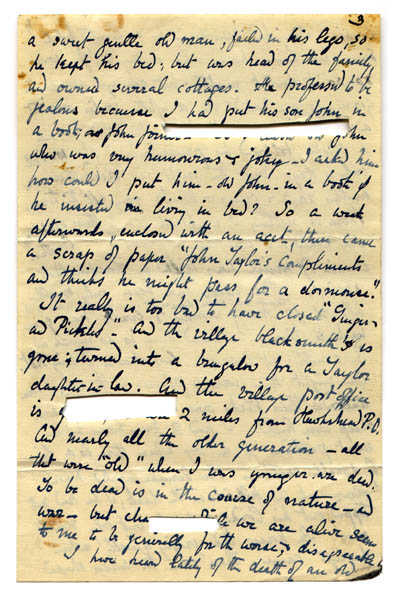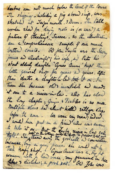 It really is too bad to have closed Ginger and Pickles. The village blacksmith’s is gone; turned into a bungalow for a Taylor daughter-in-law. And the village post office is gone [censored] 2 miles from Hawkshead P.O. And nearly all the older generation — all that were “old” when I was younger, are dead. To be dead is in the course of nature and war — but [censored] while we are alive seems to me to be generally for the worse, disagreeable.