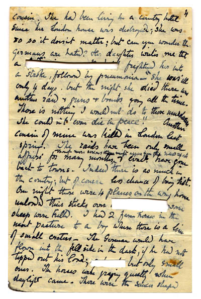 I have heard lately of the death of an old cousin. She had been living in a country hotel since her London house was destroyed; she was 80 so it doesn’t matter; but can you wonder the Germans are hated? Her daughter writes me that a [censored] frightened her into a stroke, followed by pneumonia. “She was ill only 4 days, but the night she died there was another raid and guns and bombs going all the time. There is nothing I would not do to those murderers. She could not even die in peace.”