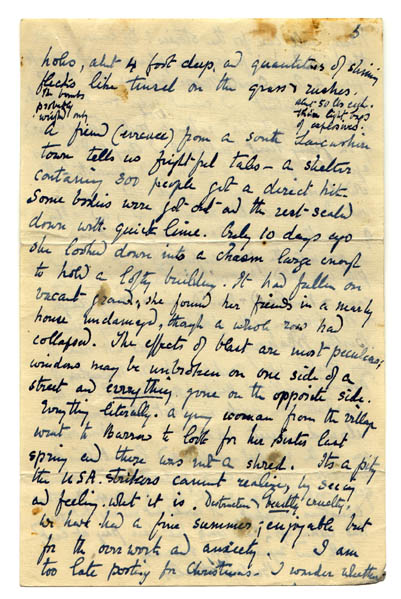 A friend (evacuee) from a south Lancashire town tells us frightful tales — a shelter containing 300 people got a direct hit. Some bodies were got out and the rest sealed down with quick lime. Only 10 days ago she looked down into a chasm large enough to hold a lofty building. It had fallen on vacant ground; she found her friends in a nearby house undamaged, though a whole row had collapsed. The effects of blast are most peculiar; windows may be unbroken on one side of a street and everything gone on the opposite side. Everything literally. A young woman from a village went to Barrow to look for her sister last spring, and there was not a shred. It’s a pity the U.S.A. strikers cannot realize, by seeing and feeling, what it is. Destruction and beastly cruelty.