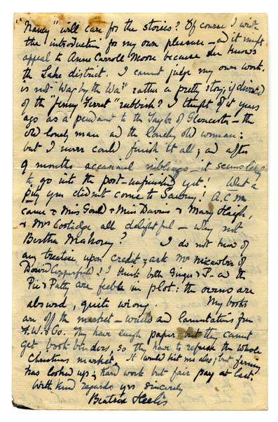 I am too late posting for Christmas. I wonder whether Nancy will care for the stories? Of course, I wrote the introduction for my own pleasure — and it might appeal to Anne Carroll Moore because she knows the Lake district. I cannot judge my own work. Is not “Wag by the Wall” rather a pretty story, if divested of the “Jenny Ferret” rubbish? I thought of it years ago as a pendant to The Tailor of Gloucester — the old lonely man and the lonely old woman — but I never could finish it all; and after 9 months occasional nibblings, it seems likely to go into the post — unfinished yet!
