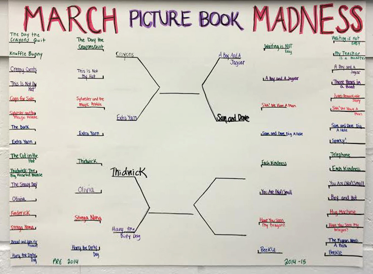 I was scouring through my daily dose of teacher blogs (a heavily addicting recreational activity, though I highly recommend it) when I came across an article in one of my absolute favorites. The Nerdy Book Club (yes, that’s its real name) was advocating for countrywide participation in a March Madness book battle. Over 700 schools across the US were putting in their picks for top-seeded picture books, middle grade novels, or young adult fiction. The website would then generate a bracket, with classrooms everywhere participating in the “madness!” My class just had to get in on all the fun — what an exciting excuse to indulge into picture books, and providing a fun incentive for read-aloud time!