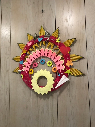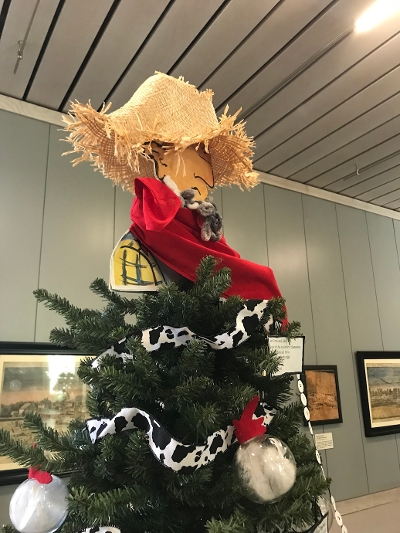 We tried to identify materials used: paper clips, sticky notes, and yellow legal paper folded into hearts, chains, and tiny paper airplanes for the Off-Limits wreath; a litany of recycled items repurposed for ornaments portraying the ocean life Over and Under the Waves (fish with bottle cap fins and jellyfish tentacles made from newspaper plastic bags); tree skirts made from world maps for The Boy Who Loved Maps or envelopes addressed to Emerson Weber, author of Sincerely, Emerson.