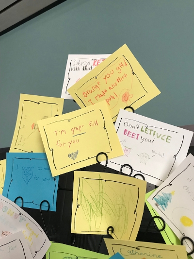 We paused longer at those trees that allow young visitors to take inspiration from their book’s message. One year, guests were invited to write their own food-related wordplay (“Orange you glad I made another pun?”; “I’m grape-full for you”; a snowman declaring, “I love BRRR-gers!”) and add them to a small wire tree next to the punny Let’s Taco About How Great You Are tree. Another time, we spent nearly fifteen minutes reading the poems that a first grade class from Thoreau Elementary had written to cover their tree for How to Write a Poem (“My Bio Poem: I am special, I love my mom, I need gum, I want a puppy!!!”; “My Color Poem: Orange...tastes like oranges...smells like pumpkin pie...sounds like a fox...reminds me of haluween [sic]”).
