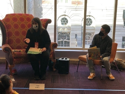 Last Saturday the Boston Book Festival was back in-person (yay) for the first time since 2019, and people turned out in droves to enjoy the beautiful weather and a day full of wonderful discussion about books for the young and the young at heart. The Horn Book once again had a booth at the Copley Square Street Fair (courtesy of the Boston Globe), where we participated in the festival's Passport to Imagination scavenger hunt program for kids; displayed the 2022 Boston Globe-Horn Book Award winners and honorees; encouraged people to subscribe and sign up for our newsletters; and gave away copies of the Magazine, along with bookmarks, posters, pens, and stickers. Our thanks to staff members Elissa Gershowitz, Martha V. Parravano, Shoshana Flax, and Cynthia Ritter, and fall interns Lisa Roberts and Roshni Patel for taking turns running the booth all day. Below are some staff highlights from the event. Welcome back, BBF!