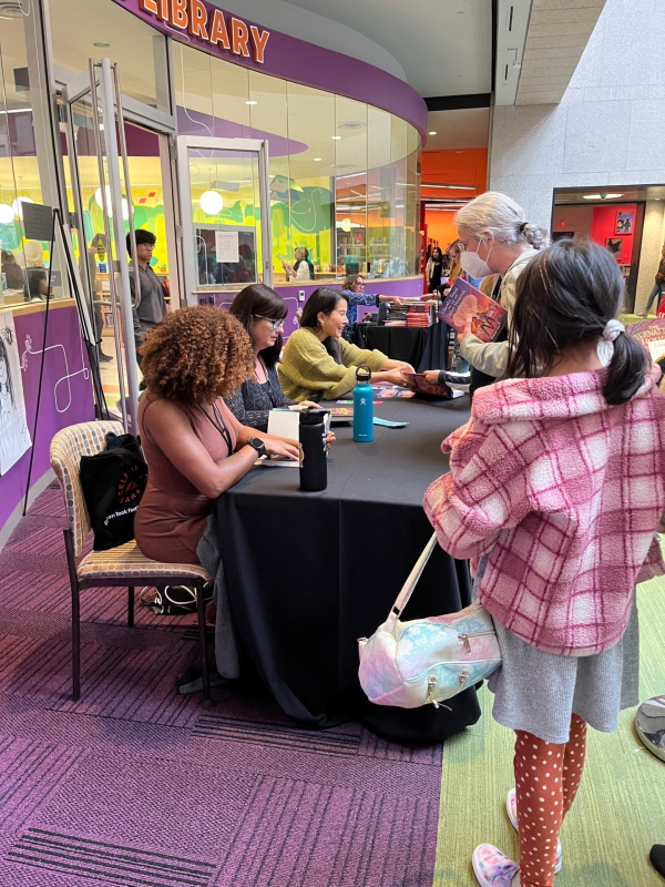 This year was my first year attending the Boston Book Festival. Since I hail from Texas, I’m used to Texas-sized book festivals and wasn’t sure how the Boston Book Festival would compare. Although the Boston Book Festival is smaller scale than the Texas Book Festival held in Austin, it was no less busy when I arrived on scene. I spent about two hours at the Horn Book’s booth with fellow intern Emma Shacochis introducing newcomers to the Horn Book’s mission, fielding questions, and receiving heartfelt appreciation from librarians, educators, and parents for the work the Horn Book does. Outside of my shift, I wandered, browsed, queued, and impulse-bought my fair share of books. I didn’t get to catch every panel I wanted to attend for timing or space reasons, but I did land a first-place spot in the signing line for the middle grade “Furry Friends” panel. I also had a quite a few chance encounters and reunions with fellow Simmons University students in the children’s literature program. Toward the end of the day, I had the pleasure of listening to the young adult keynote speaker Chloe Gong and meeting her in person for the first time after a longtime online Twitter acquaintanceship. All in all, it was a satisfying festival day, and I went home with a very full backpack and an even fuller heart.