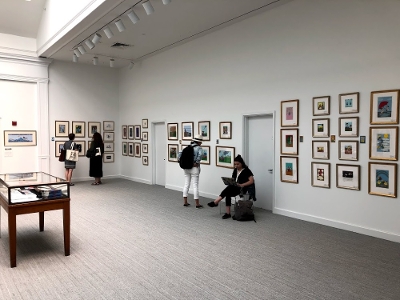 I next went to the Trustman Gallery to check out Grace Lin’s gorgeous art exhibit: “Make Way for Dumplings: 20 Years of the Art of Grace Lin.” I had never seen her original illustrations in person before, and I came away with a real appreciation for just how beautiful they are as works of art. From the patterned clothing her characters wear (which look like collage but are all hand-drawn!) to each snowflake being truly one of a kind, something about each piece caught my eye, including a cameo by a certain mooncake-eating little girl (from Caldecott honoree A Big Mooncake for Little Star) in the window of one scene from Lin’s forthcoming A Big Bed for Little Snow.