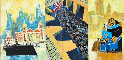 CL: That’s right, I didn’t. Honestly, Roger, I think Evan made this book. My words are only words on the page. Coincidentally, two reviews refer to my writing as “smooth.” I don’t know if I thought of it that way — I struggled over every single word and sentence, and it took me several years to get this as right as I could. But as soon as I saw Evan’s artwork, the whole book just came to life for me, as an experience for readers. Another review said something like “the perfect melding of politics and art,” and I think that’s right. Both the writing and the artwork convey Ben as a political artist. Every time I go through the book, I find more to love about Evan’s art. He and I are doing a launch together on April 28, and we’re going to ask each other questions. There’s so much I’d like to know about what I see in his illustrations — the sort of echoing of Hebrew calligraphy, in the shapes of the leaves, for instance; the way he incorporated Ben’s artwork in places, such as the Sacco and Vanzetti series. The triptych of the family arriving in New York that Evan so brilliantly conveyed in a wordless spread that I didn’t even have in my mind — I just love that spread, because it conveys so much about the immigrant experience. The startling and evocative portrait of Dr. Martin Luther King Jr., which I assume you pulled from the Time magazine cover — it’s so much like that portrait, but your own work. What first struck me when I saw the illustrations was that they’re disorienting. The collages, the juxtapositions of people, various points of view, even within one illustration. It matches the disorientation of the times that Ben lived through and responded to. It made the most perfect connection. I love that. And then there’s also the thing about the eyes and the hands...but I should stop talking and let Evan have a turn.