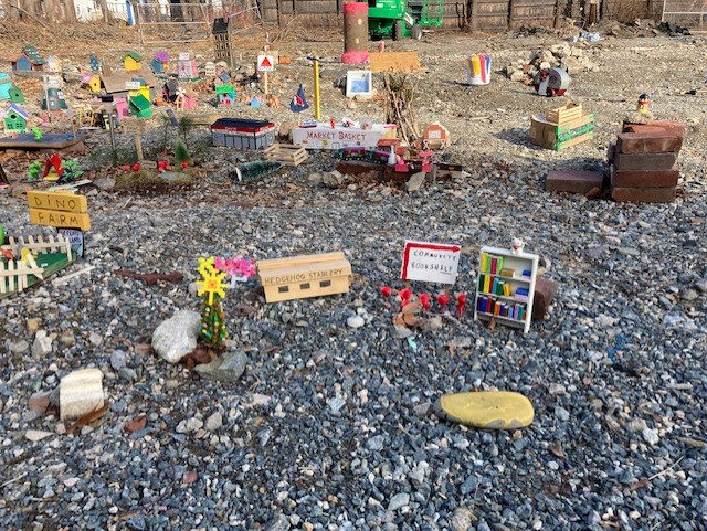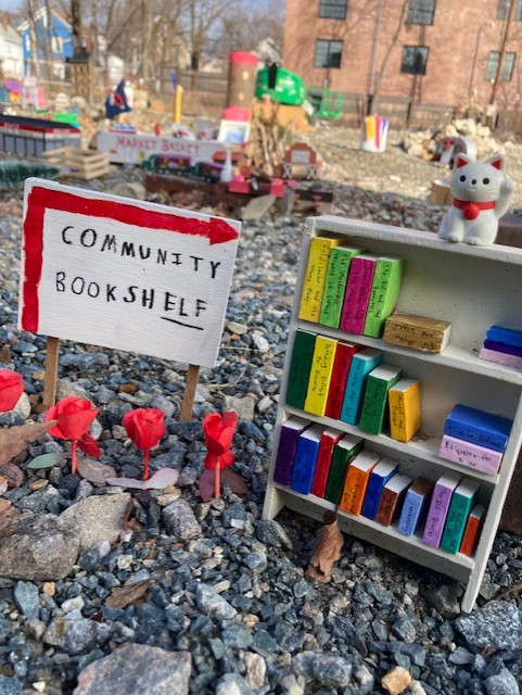 And since August 2021, friends and strangers have added all sorts of amenities, including a grocery store, Dunkin’ Donuts, a skating rink, a camp site, and hedgehog stables. Elissa and I were especially pleased to see there’s a public library and a community bookshelf.