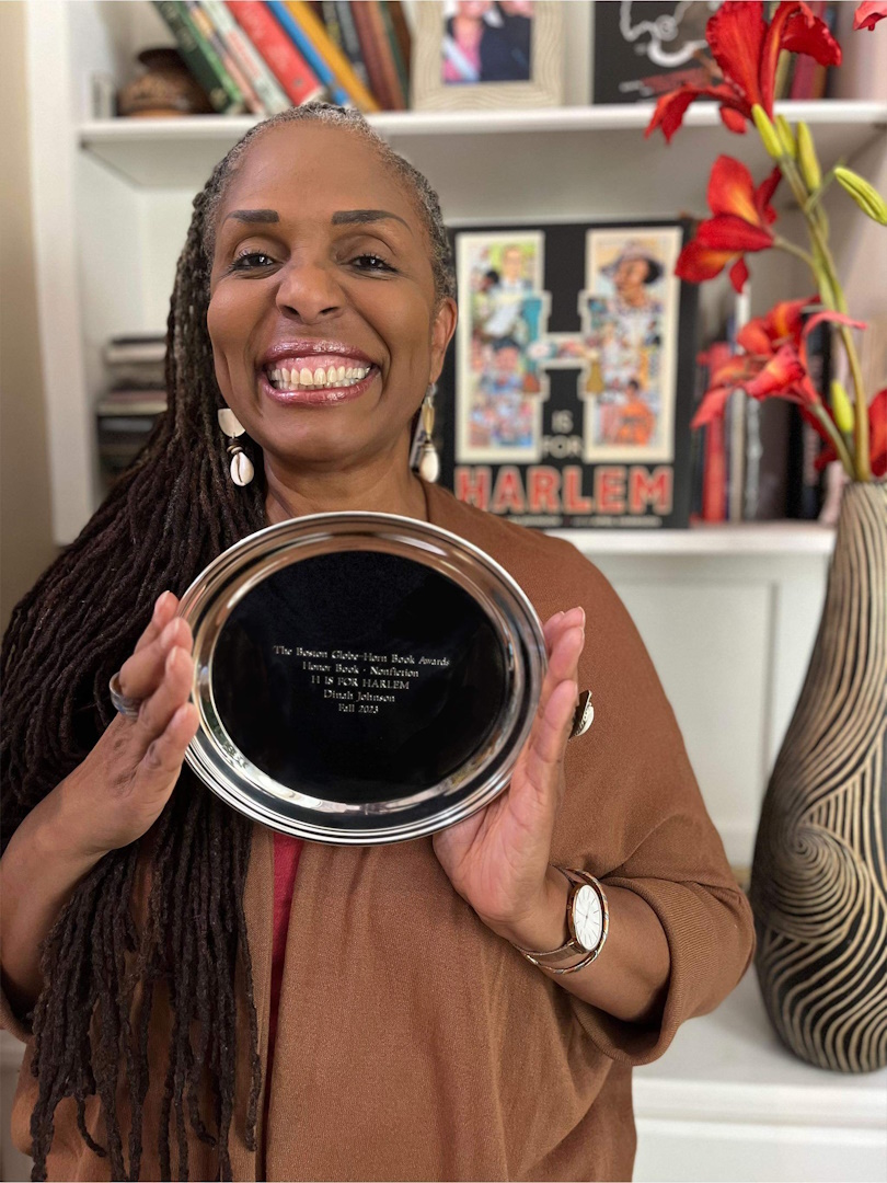 Dinah Johnson received a 2023 Boston Globe–Horn Book Honor Award for Nonfiction for H Is for Harlem (Ottaviano/Little, Brown), illustrated by April Harrison.
