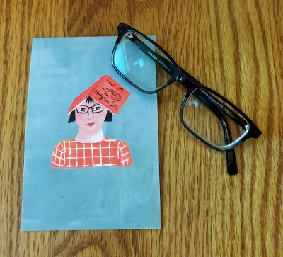 The woman with the hedgehog book on her head was my favorite though I didn't see her painting on the walls, so when I was finished getting my glasses fitted, I asked if I could take a photo of the display and the employees nicely offered to let me choose a free souvenir postcard to take home. Since the checkered-shirt-clad woman intrigued me and her glasses most resembled mine, I obviously picked that one.