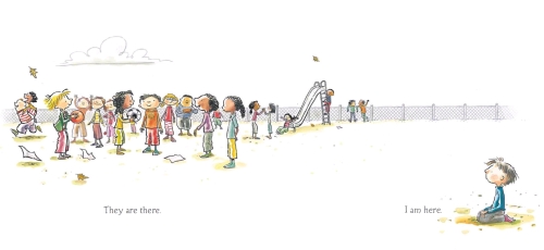 Reynolds depicts scenes familiar to many a kid coping with ASD in sparse, simple text: "They are there. I am here." is accompanied by a gulf of white space between a group of kids playing and one boy who just looks, well, confused.