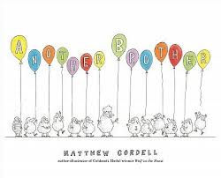 One such story is Another Brother by Matthew Cordell. Davy, who happens to be a sheep, is content when his family consists of him and his parents. Then more brothers arrive, one after another and another, until Davy is followed everywhere by his twelve brothers, each one copying Davy’s every move. When Davy burps, twelve brothers burp. When Davy acts like a monkey, twelve brothers act like monkeys. (The illustration of thirteen sheep acting like monkeys is classic.)