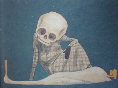 With sparse illustrations (lithographic print and colored pencil collage), the book is beautifully macabre. The characters have a tender relationship, and Duck’s surprised reactions to Death’s blunt sense of humor are a pleasure. Some readers may be creeped out by the subject matter; others may appreciate the story’s honesty and frankness. Erlbruch offers no speculation about an afterlife: when Duck asks if the dead sit on a cloud or roast deep in the earth, Death only states, “You ducks come up with some amazing stories.” Erlbruch tells the reader that, while death may be frightening, it isn’t inherently evil or wrong. As Death lays a tulip on Duck’s body and watches her drift away on the great river, he is “almost a little moved. ‘But that’s life,’ thought Death.”