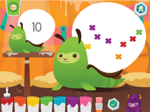 Moose Math (Duck, Duck, Moose, 2013; iOS and Android) opens onto a brightly colored city featuring three shops: Moose Juice, Puck’s Pets, and Lost and Found. Each shop offers its own game(s), each with six levels. When you reach the end of any level, you may choose an item to customize your city (a new door for the shop, pinwheels for the yard, etc.). Swipe left and right to view the different shops; tap on a shop’s door to enter and begin a game.