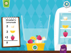 Inside smoothie shop Moose Juice, a recipe card indicates which fruits are needed to make juices such as “Sassy Orange” or “YaYa Lemonade.” The recipe cards are given as simple addition problems (an "Orange Fiesta," for example, is 2 orange slices + 4 carrots + 2 pears = 8 total fruits). Drag the correct number and type of fruits to the blender. As the levels continue, the math becomes more complex, sometimes requiring you to remove excess ingredients from the blender. If you get stuck, tap the purple bird in the lower right corner and she will prompt you with what to do next.