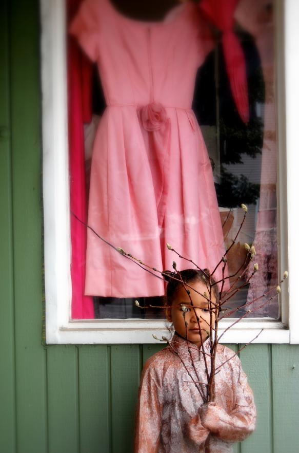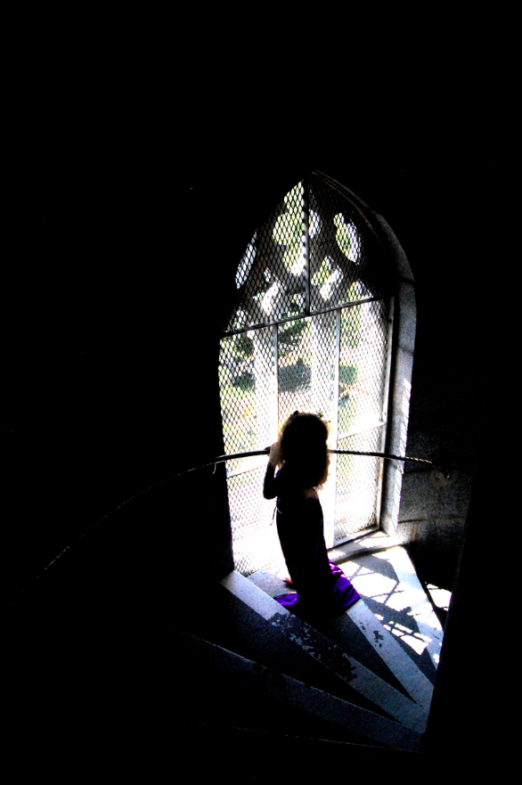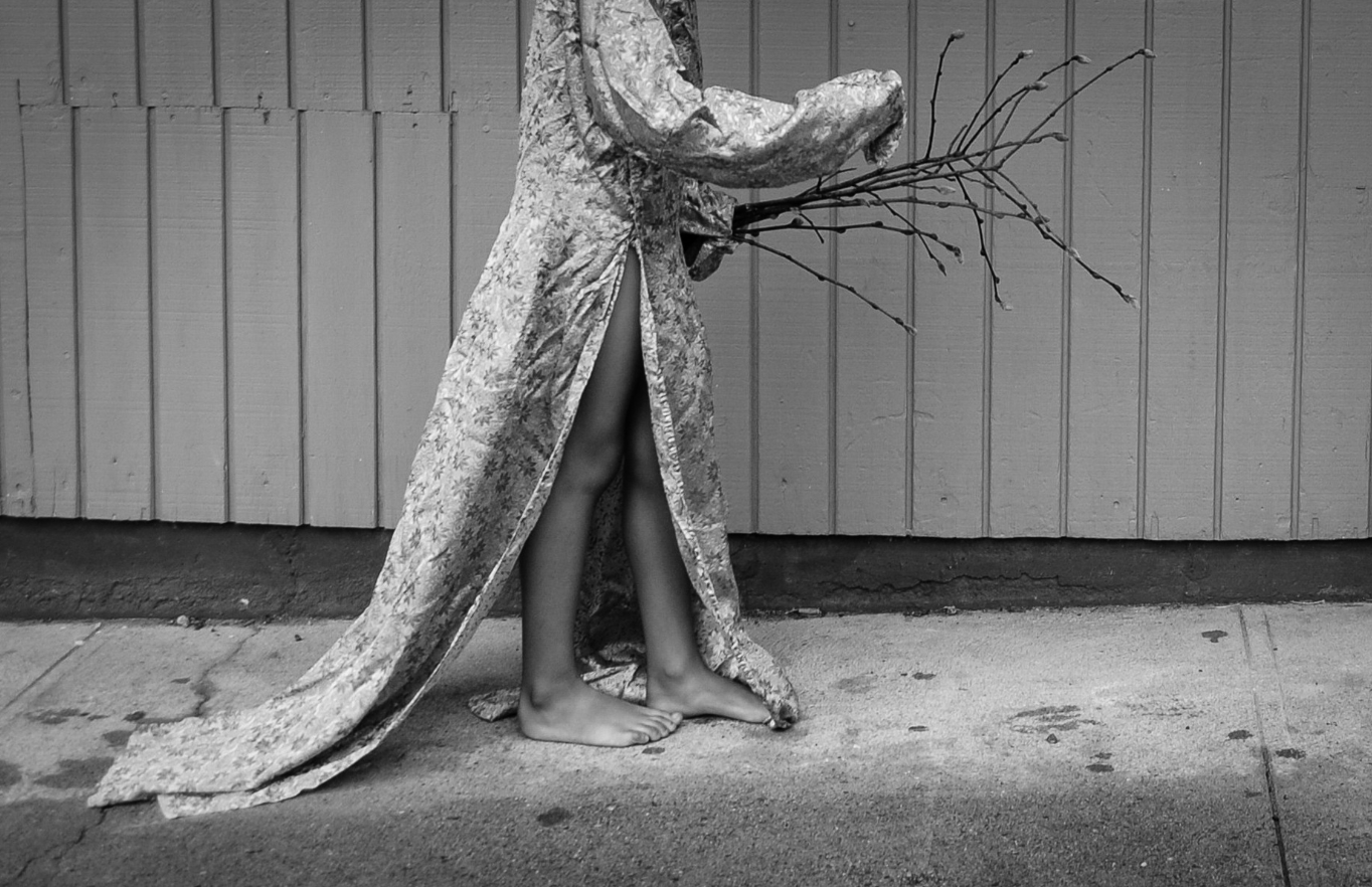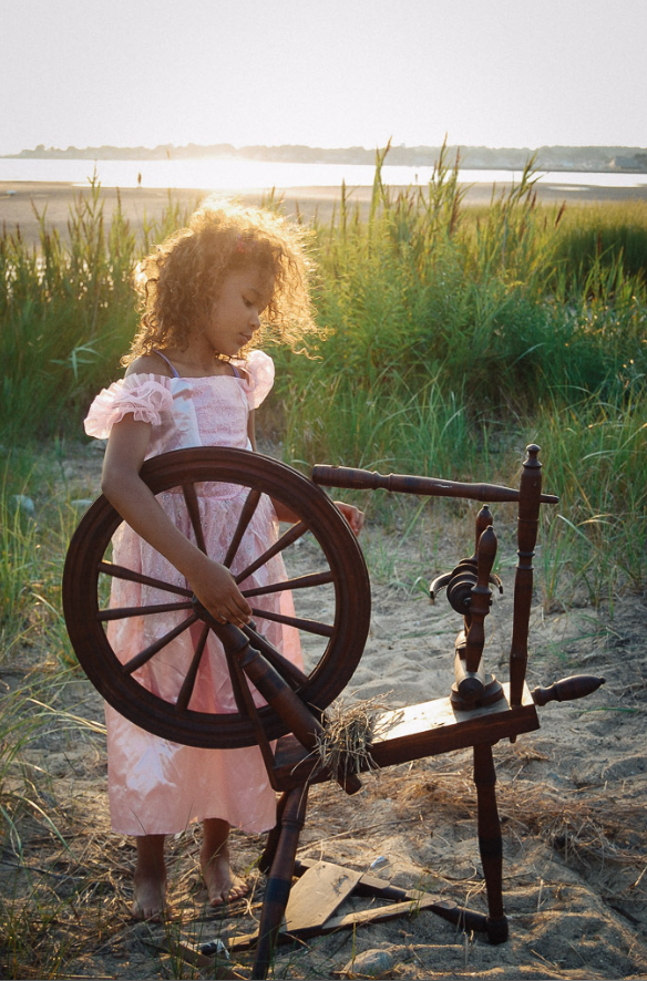 As a photographer, I had a tool to use in order to place my daughter directly into the stories as the main character. Over the next few months we collaborated on our own illustrative versions of several fairy tales. I intentionally used minimal props, as I hoped a balance of restraint and expression, so prevalent in these redolent tales, would come through naturally. A large piece of red felt, wildflowers picked beyond the walking path inside of Mt. Auburn Cemetery, an old hat that belonged to my son, and a Goodwill find or two were all we used. The most obvious prop was a spinning wheel, which believe it or not, I borrowed from my mother.
