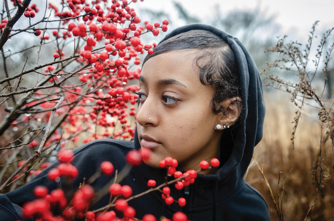 "When I was little, I really loved watching fairy tales and getting to read all the books. But one thing that stood out was the lack of diversity across all the films. Even when The Princess and the Frog came out, Tiana was a frog for about ninety percent of the movie. She was Disney’s first Black princess, yet she wasn’t showcased. This was an opportunity to show diversity, but it didn’t happen. Still, for a long time she was the only Black fairy-tale princess. This is a repetitive pattern in which Disney casts people of color as animals for the majority of the film. Overall, if I had representation growing up, my life would have been different. I wouldn’t have ingrained ideals of what’s beautiful, and I would know that my skin is as important as everybody else’s.” [Apple, at left. This photo is copyright 2024 by Kristen Emack. All rights reserved.] —APPLE
