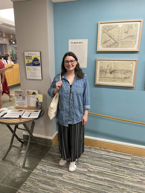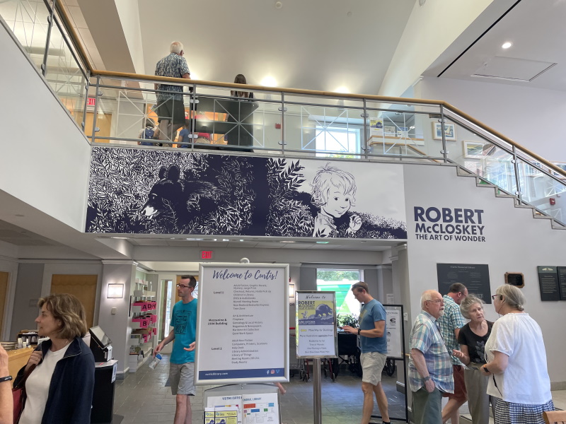 “Robert McCloskey: The Art of Wonder,” currently on display at the Curtis Memorial Library in Brunswick, Maine, through October 15, 2023, makes for a delightful daytrip from the Boston area. This past weekend, I attended one of the exhibit events, a reading of Blueberries for Sal by Sally McCloskey herself. I was grateful that Development and Marketing Manager Joyce Fehl offered to set aside some seats for me; half an hour before the event, there was already a line around the block. Inside, the room filled up quickly, but there was ample space in the front at the foot of Sal’s chair covered with bright carpet squares reserved for kids.