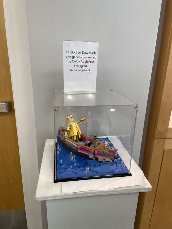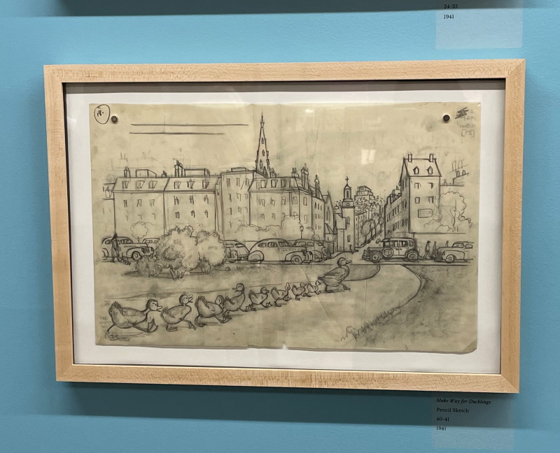 Sal’s reading was a special experience, but the rest of the exhibit is just as gripping. The library has several pieces on loan from the May Massee Collection at Emporia State University, including original sketches and artwork from McCloskey’s five most famous picture books, arranged around the children’s section and stacks on the first and second floors of the building. Between displays, large, hand-painted scenes from Blueberries for Sal adorn the walls. Other items on view include a translated edition of Make Way for Ducklings and a LEGO replica of Burt Dow in his boat, the Tidely-Idely. This is also the last time that the fragile sketches from Make Way for Ducklings, perhaps McCloskey’s best-known work (at least in our neck of the woods), will be displayed publicly. (And, don’t worry, we sent Sal home with a copy of the 2014 Horn Book that featured one of her father’s illustrations.)