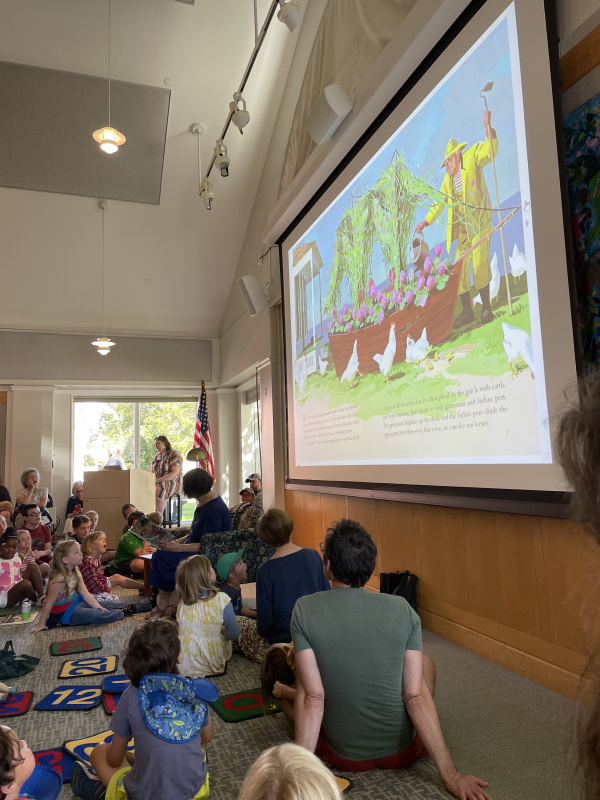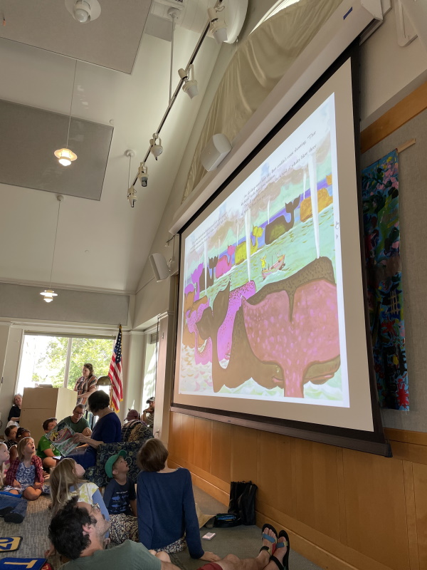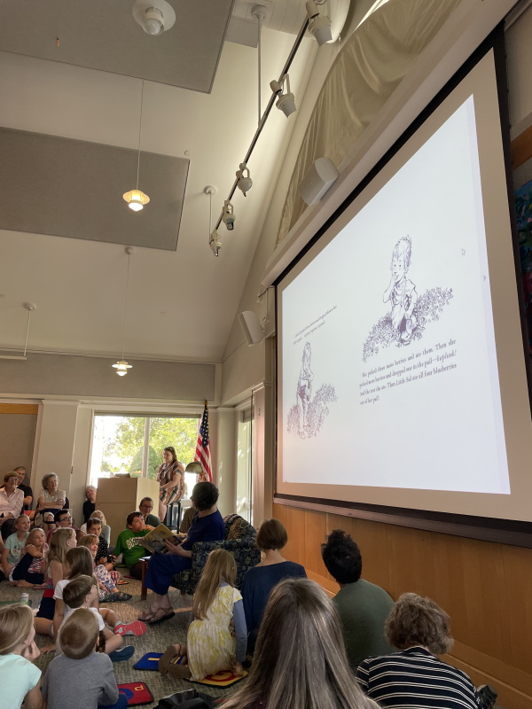 Sal treated the hour like regular storytime, albeit with incredible interjections about the real-life inspiration for her father’s books about Maine. Images of each page were projected behind her as she read, starting with Time of Wonder. There was the usual gentle murmur of storytime, and a perfectly timed cry of “oh no!” when the story’s hurricane hit. But Sal had everyone enraptured from the start — even the littlest listeners fell silent when Sal read the wave’s “SH-h-h-h...SH-h-h-h...SH-h-h-h” after the storm. Sal got teary-eyed at the end of the book (and so did I) when she shared that this was what she and her sister, Jane, read to their father as he passed away.