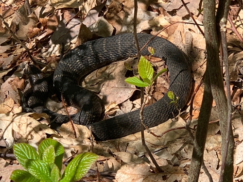 The kids were fascinated; the parents were...cautious. We stayed far away (TY camera zoom! photo by Ken Silber), and luckily the creature had no interest in us and stayed mostly curled up. When we got home, the children did some reasarch about snakes native to Massachusetts, then wrote to the Friends of the Fells with some questions ("school" assignment! win-win!). Turns out this is a Northern Watersnake, female, and can be aggressive ("While they will usually flee when agitated, they have been often known to turn and fight when disturbed," warned Jesse from Friends of the Fells).