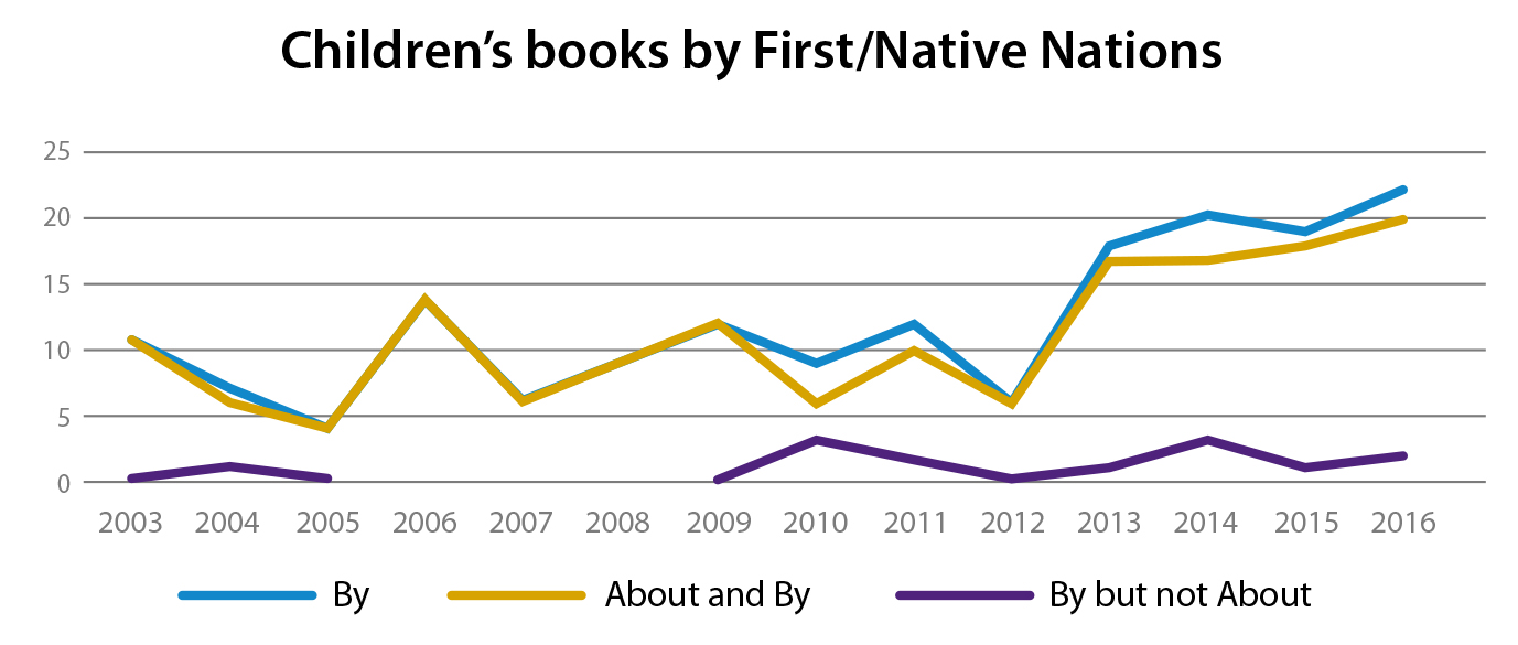 KTH: The numbers over time for books by and about First/Native Nations tell an interesting story. In 2003, a whopping 88% of the books were created by non-Native writers and illustrators. That number plummeted the following year and has held steady since then at about 60%. I believe that is due to the hard-hitting criticism from the Native organization Oyate and, more recently, Debbie Reese at her blog American Indians in Children’s Literature. They have made authors and publishers aware of how little outsiders generally know about individual Native nations, or First/Native Nations in general. We don’t have that same consistent level of cultural criticism for books about African American, Asian/Asian American, and Latinx people.